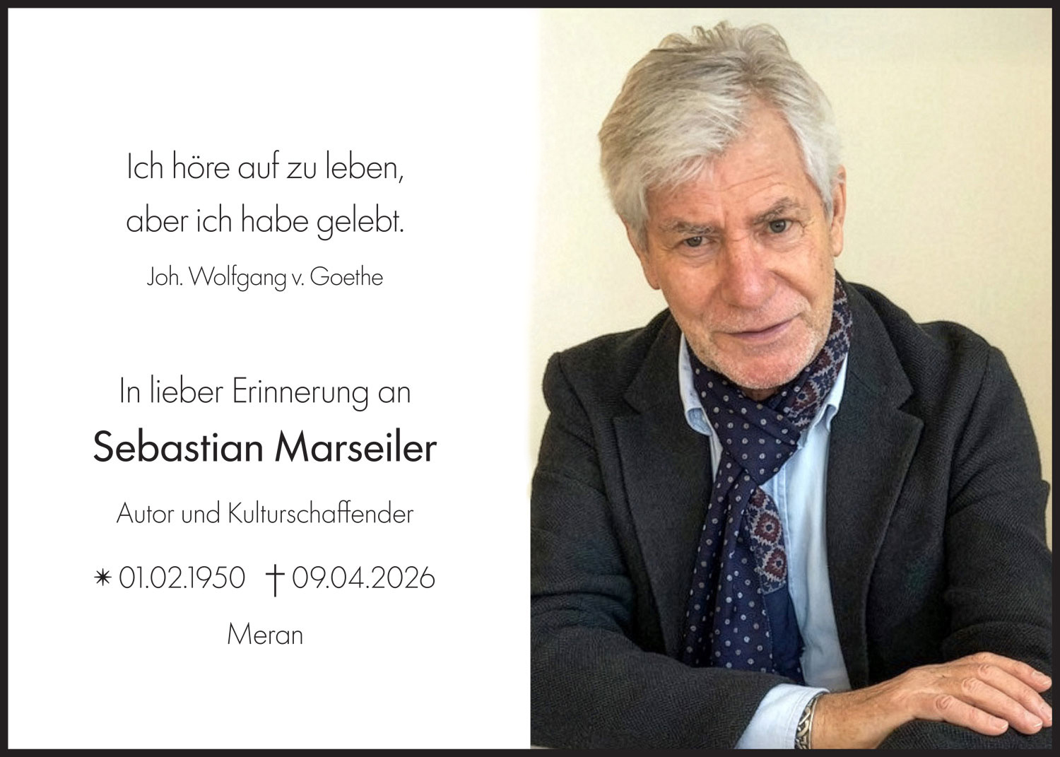 Die Ortlerfront im Ersten Weltkrieg war Dir in Deinen Arbeiten ein besonderes Thema. Über Vieles aus jenen dunklen Tagen durften wir uns mit Dir unterhalten. Du hast uns Einiges erzählt von Deinen Funden,Eindrücken, Gesprächen mit den letzten Zeitzeugen - nicht zuletzt in deinen literarischen Werken, mit deiner klaren Sprache. Lebewohl auf deiner letzten Bergtour, lieber Sebastian, gehe nun über die geliebten Ortlerberge hinüber ins Licht. Franz Angerer, auch im Namen des OSV-Ortler Sammlervereins.