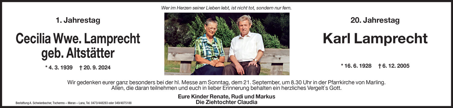 Entzünden Sie als Symbol der Ewigkeit eine Kerze, zum Gedenken an Cecilia Wwe. Lamprecht geb. Altstätter.