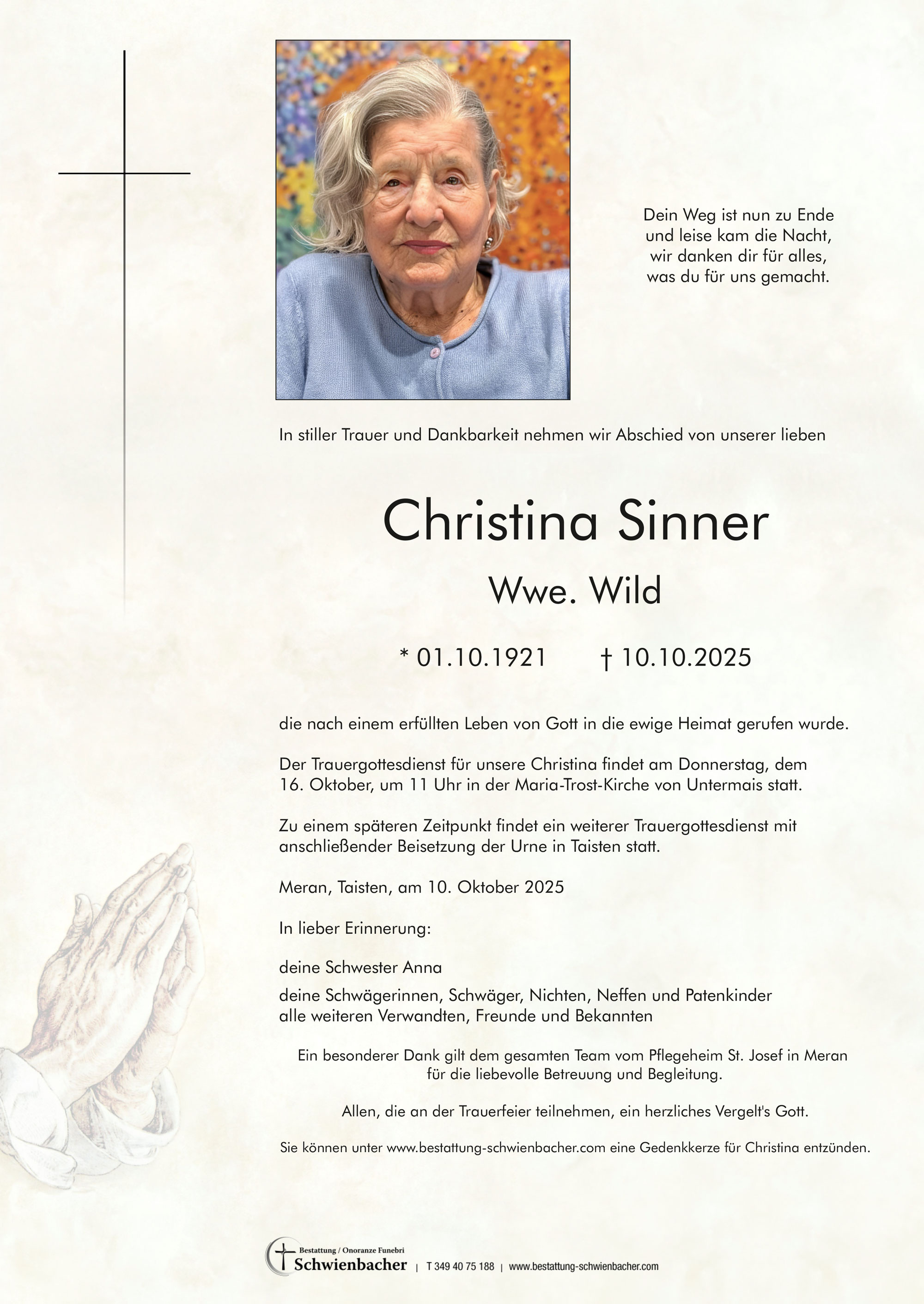 Entzünden Sie als Symbol der Ewigkeit eine Kerze, zum Gedenken an Christina Wwe. Wild geb. Sinner.